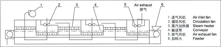 DW系列帶式干燥機(jī)料斗中的物料由加料器均勻地鋪在網(wǎng)帶上,網(wǎng)帶采用12-60目不銹鋼絲網(wǎng),由傳動(dòng)裝置拖動(dòng)在干燥機(jī)內(nèi)移動(dòng)。干燥段由若干單元組成,每一單元熱風(fēng)獨(dú)立循環(huán),其中部分尾氣由專門排濕風(fēng)機(jī)排出,每一單元排出氣量均有調(diào)節(jié)閥控制。在上循環(huán)單元中,循環(huán)風(fēng)機(jī)出來(lái)的風(fēng)由側(cè)面風(fēng)道進(jìn)入單元下腔,氣流向上通過換熱器加熱,并經(jīng)分配器分配后。成噴射流吹向網(wǎng)帶,穿過物料后進(jìn)入上腔。干燥過程是熱風(fēng)氣流穿過物料層,完成熱量與質(zhì)量傳達(dá)過程。上腔由風(fēng)管與風(fēng)機(jī)入口相連,大部分氣流體循環(huán),一部分溫度較低含濕量較大的氣體作為廢氣經(jīng)排濕管、調(diào)節(jié)閥、跳濕風(fēng)機(jī)排出。下循環(huán)單元中,循環(huán)風(fēng)機(jī)出來(lái)的風(fēng)先進(jìn)入上腔,向下經(jīng)換熱器加熱,穿過物料層進(jìn)入下腔,下腔由側(cè)面風(fēng)道及回風(fēng)管與風(fēng)機(jī)入口相連,大部分氣體循環(huán),一部分排出。上下循環(huán)單元根據(jù)用戶需要可靈活配備,單元數(shù)量亦可根據(jù)需要選取。