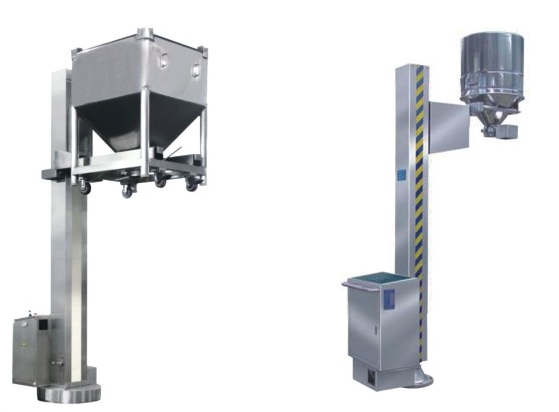 該機由底盤、立柱、提升系統(tǒng)等部件組成。工作時,先將裝有物料的料斗推進料斗提升機的提升叉架上。然后啟動提升按鈕,料斗做提升運動,料斗到位后轉(zhuǎn)動底盤與加料的設(shè)備密閉對接,開啟出料蝶閥,使物料密閉轉(zhuǎn)移到下一工序。